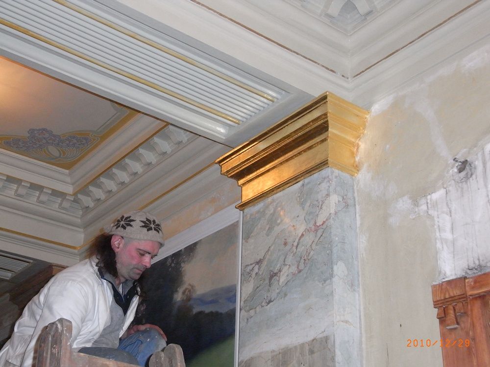 Sep.2010-Feb. 2011 Restaurator Gerd Alpha Restauration der Eingangshalle, Rückführung in den Originalzustand von 1902 durch Freilegung und Retusche, nebst Freilegung und Wiederherstellung der 4 Gemälde, Vergoldung der Kapitelle